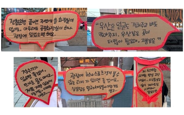 한 인간으로서 환대받아야 할 존재의 자리는 공짜여야 마땅합니다. 돈이 없어도, 돈이 많아도 똑같이 가져야 하기 때문입니다. 하지만 오늘날 서울역 광장을 보면 그 자리를 갖기 위해서는 돈이 필요한 것 같습니다. 점점 넓어져 가는 사유지에, 공공의 땅은 사라져 가고 있으니까요. 지난 홈리스 추모제 사전 마당에서는 버려진 종이박스로 줄어들어 가는 공공성의 자리를 재현해내는 전시, <공짜 의자가 필요해>를 열었습니다. 전시회 풍경을 함께 살펴봅시다.