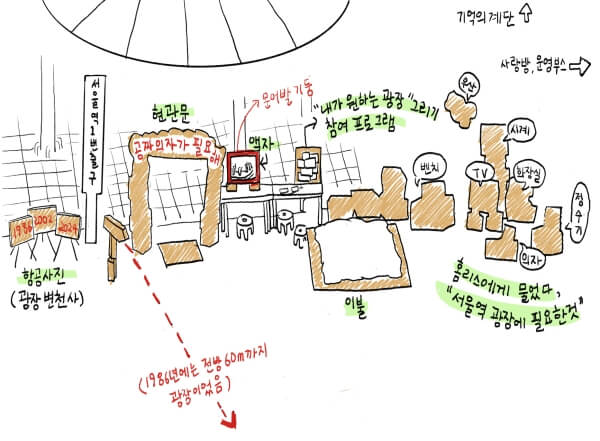 ▲ <공짜 의자가 필요해> 현장 지도 드로잉. <사진=필자>
