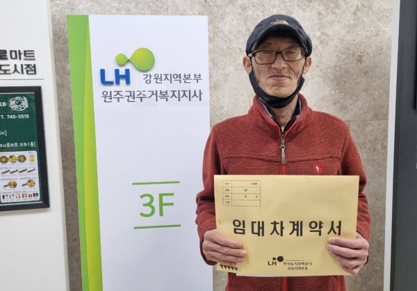 ▲ 지난해 11월, 임대주택 입주계약을 마친 신종범씨의 모습. <사진=홈리스행동>
