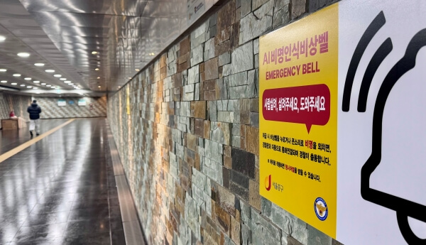 남대문 지하보도에 붙은 AI 비명인식 비상벨 안내판. <사진=홈리스뉴스 편집부>